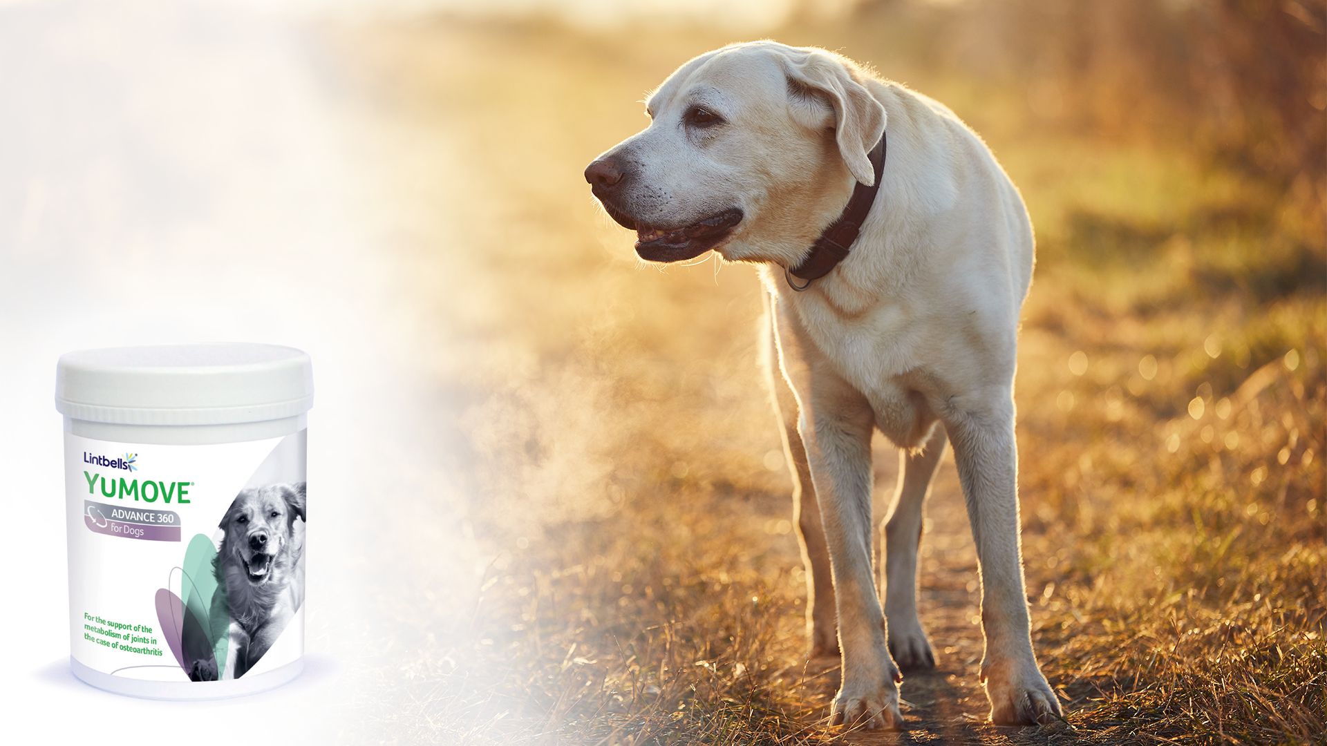 YuMOVE Advance 360 for Dogs este un supliment articular avansat pentru susținerea metabolismului articular în caz de osteoartrită, având la bază acizi grași Omega 3 extrași din ActivEase midia cu buze verzi și uleiul de pește, sub formă de pulbere, acid hialuronic, glucozamină, condroitină și N-Acetil D-glucozamină, iar ca antioxidanți, vitaminele E și C.