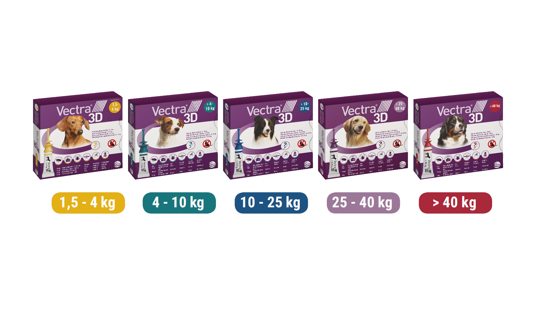 VECTRA 3D este disponibil în 5 variante, pentru a acoperi toate categoriile de greutate a patrupezilor. Recomandat pentru câini cu vârsta de minim 7 săptămâni și cu greutatea peste 1.5 kg.